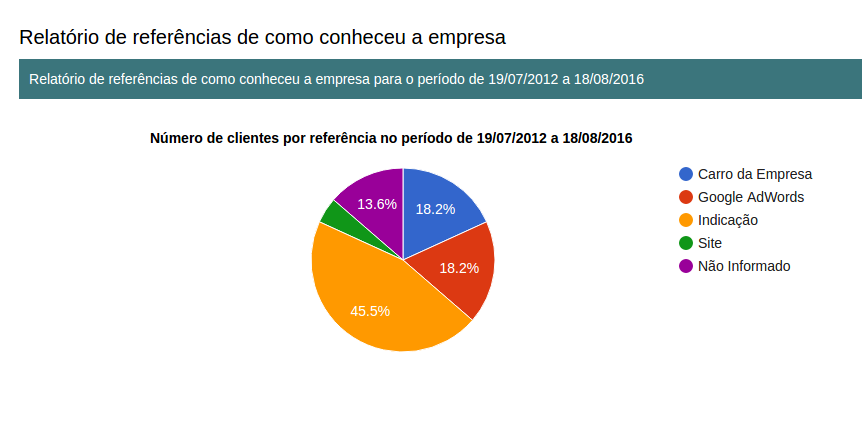 Após algum tempo usando o PragSystem e registrando as referências será possível ver o relatório de quais referências trazem mais clientes, assim é possível, por exemplo, planejar um maior investimento em uma determinada propaganda ou mesmo cancelar alguma que não tem dado retornos positivos para a empresa.