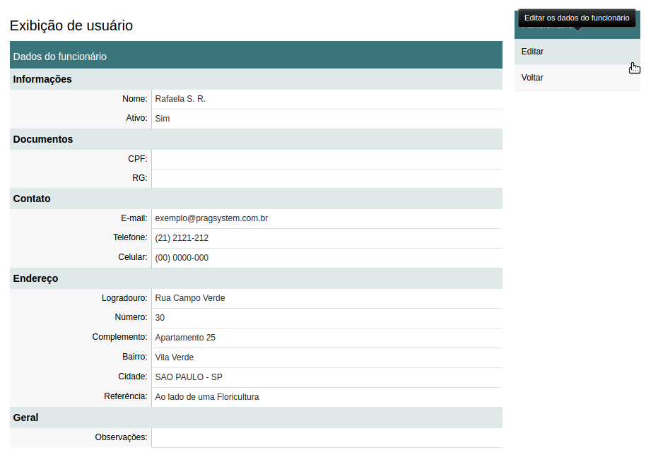 Para editar os dados de um funcionário utilize o botão à direta na lista de funcionários ou clique no nome do funcionário para ver a página com os dados do funcionário. Nesta página clique em Editar no menu lateral para ver o formulário Edição de usuário.