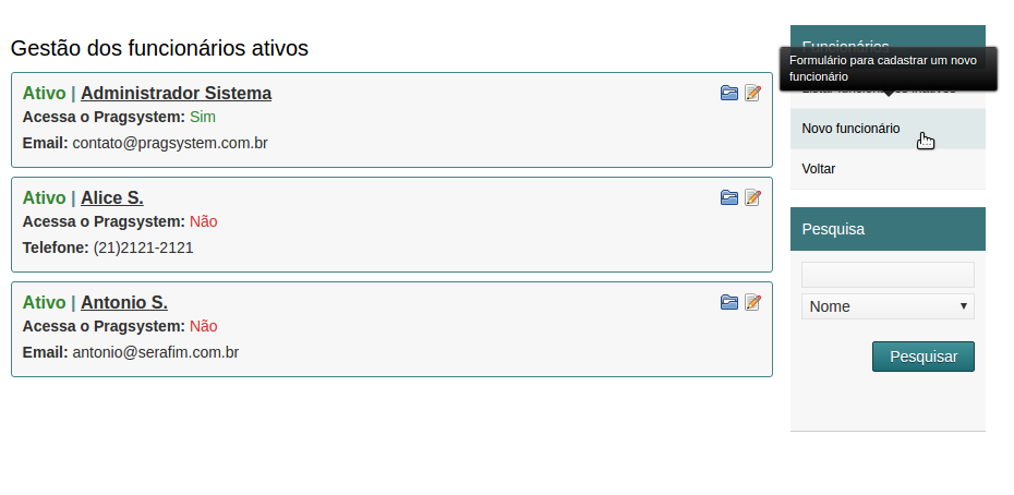 Para pesquisar por funcionários utilize o formulário de pesquisa no menu lateral na página de Gestão de funcionários ativos. Você pode pesquisar um funcionário pelo nome ou pelo e-mail.