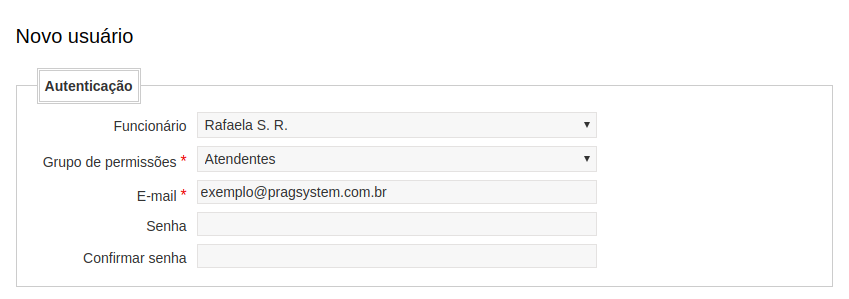 Ainda no grupo Autenticação preencha os campos E-mail, Senha e Confirmar senha. É com esta combinação de e-mail e senha que o funcionário poderá acessar o PragSystem. Você pode cadastrar uma senha padrão e pedir para o funcionário alterar a senha para uma senha pessoal mais segura.