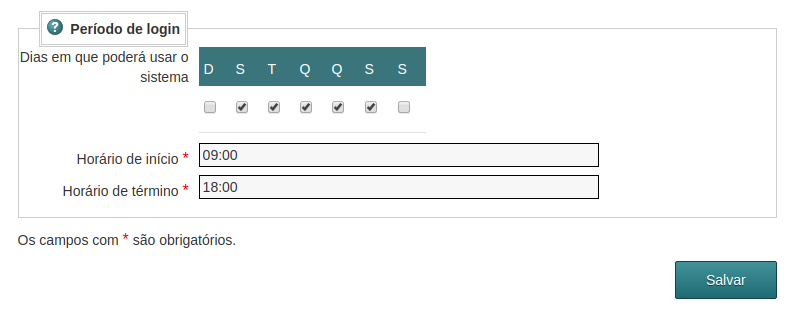 No bloco Período de login informe em quais dias da semana o funcionário poderá usar o PragSystem e durante qual horário. Para permitir o acesso a qualquer momento selecione todos os dias da semana e nos campos Horário de início e Horário de término informe os valores 00:00 e 23:59 respectivamente.