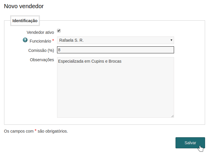 O formulário para cadastrar um vendedor contém apenas o bloco Identificação com os campos Vendedor ativo, que indica que o vendedor pode ser selecionado no cadastro de serviços, Funcionário, com uma lista de funcionários ativos para escolher, Comissão (%), que indica quanto que o vendedor recebe de comissão pelos serviços vendidos e Observações para anotações gerais sobre o vendedor, como por exemplo as especialidades de cada vendedor.