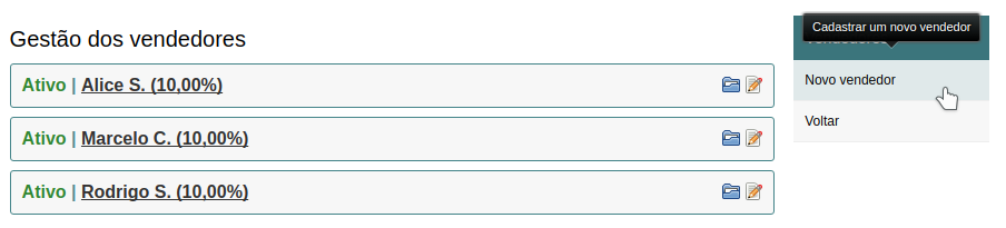 Para editar um vendedor clique na opção à direita na lista de vendedores na página Gestão de vendedores.